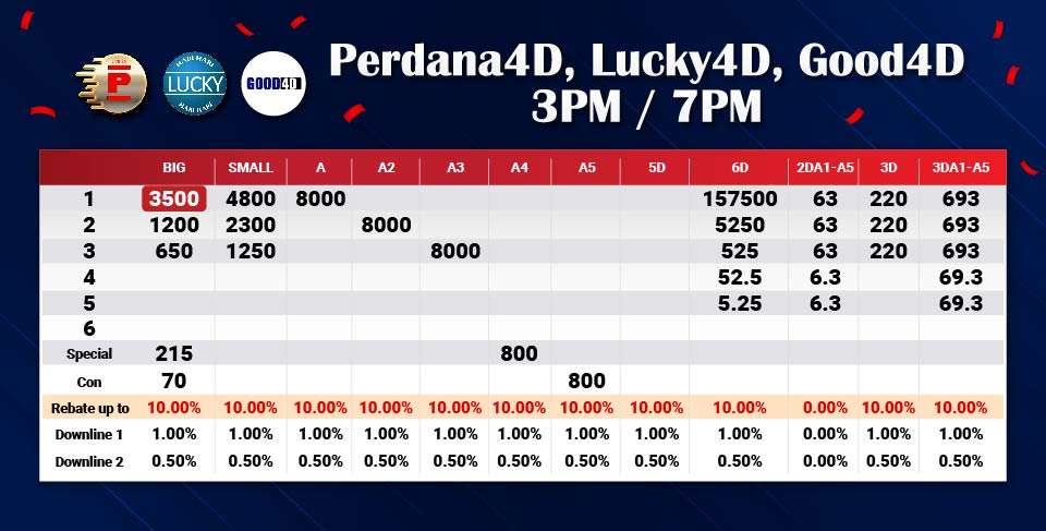 Explore the exciting Malaysia 4D Lotto prize structure on Perdana4D. This system applies to popular lottery games such as TOTO 4D, Da Ma Cai 4D, Magnum 4D, Good 4D, and Perdana 4D. Please note that the prize structure may change according to management decisions and market conditions.